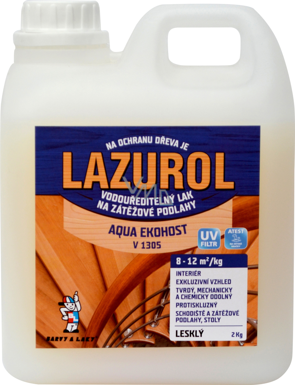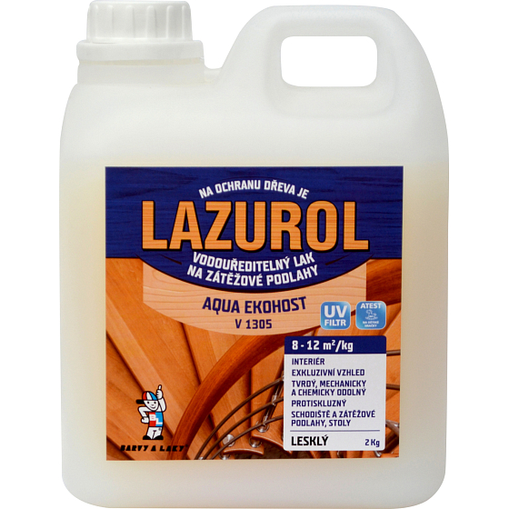 LAZUROL AQUA EKOHOST ist ein hochprozentiger polyurethan-Wasserlack mit hoher Widerstandsfähigkeit, Härte und ansprechendem Aussehen, der die Maserung des Holzes betont. Er wird für die Beschichtung von Holz im Innenbereich (Möbel, Parkett, Korkbeläge) und für die Beschichtung von saugfähigen Materialien (MDF-Platten, Sperrholz) verwendet. Er enthält einen UV-Filter. Er wird als transparenter Lack in satinierter und matter Ausführung hergestellt. Er erfüllt die Anforderungen an die Rutschfestigkeit.
