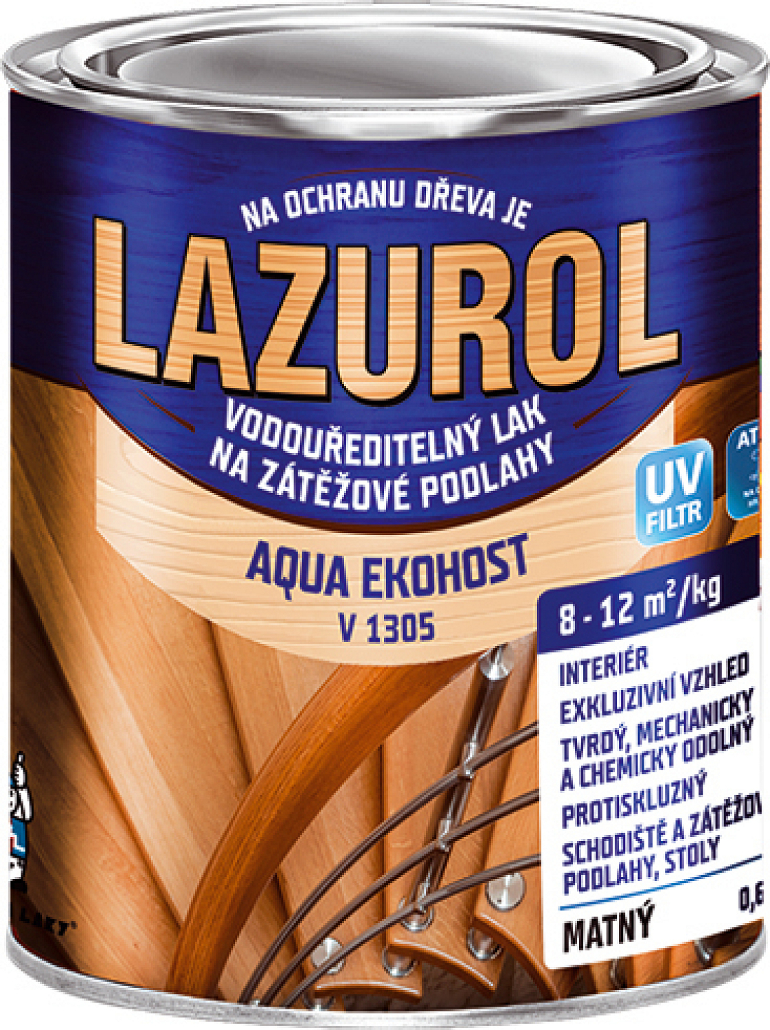 Lazurol Aqua Ekohost mat V1305 Fußbodenlack ist ein hochprozentiger polyurethan-wasserverdünnbarer Lack mit hoher Beständigkeit, Härte und ansprechendem Aussehen, der die Holzmaserung betont. Er wird für Beschichtungen von Holz in Innenräumen (Möbel, Parkett, Korkbeläge) und für Beschichtungen saugfähiger Materialien (MDF-Platten, Sperrholz) verwendet. Enthält UV-Filter. Er wird als klarer Lack in seidenmattem und mattem Finish hergestellt. Er erfüllt die Anforderungen an Rutschfestigkeit.