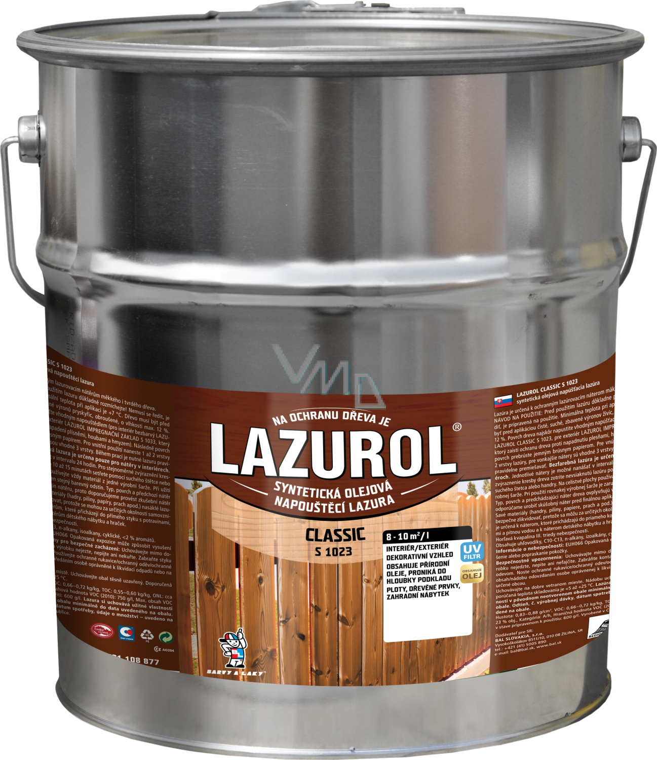 Lazura na dřevo S1023 je určena k ochranným lazurovacím nátěrům měkkého i tvrdého dřeva, vystaveného povětrnostním vlivům i k nátěrům v interiérech. Chrání dřevo před účinky UV záření. Obsahuje přírodní olej. Lazura na dřevo hluboce proniká do struktury dřeva, zvýrazňuje jeho přirozenou kresbu a tím poskytuje vysoce efektní nátěry. Vyznačuje se velmi snadnou obnovitelností starého nátěru. Odstín 0000 - bezbarvý je určen pouze pro použití v interiéru!!