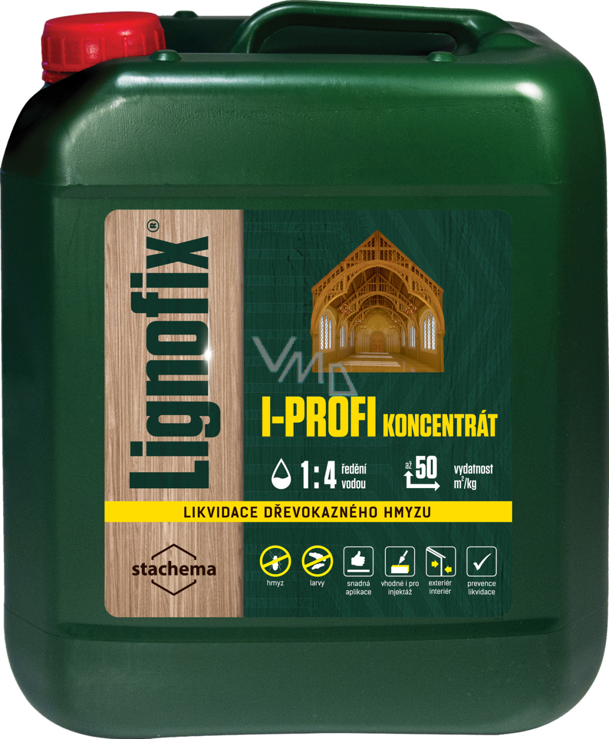 Lignofix I-profi ist ein flüssiges Mittel zur Behandlung von Holz, das von Holzschädlingen (Holzwurm, Bockkäfer usw.) befallen ist, und zur vorbeugenden Behandlung von Holz gegen Holzschädlinge in Innenräumen (Dachkonstruktionen, Verkleidungen, Treppen, Böden usw.) sowie im Außenbereich ohne direkten und dauerhaften Kontakt mit dem Erdreich (Dachüberstände, Holzbauten, Zäune, Sparren usw.).