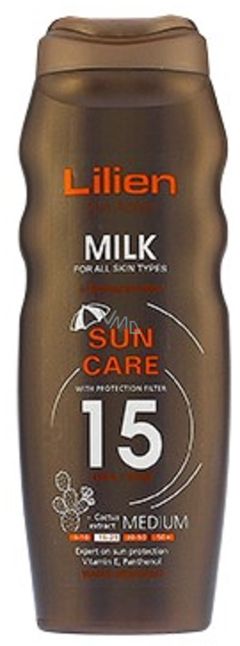 Pokud jste snědý typ a Vaše kůže přirozeně hnědne, nemusíte sahat po prostředcích s vysokým ochranným faktorem. Přesto byste ale měli svou pokožku chránit před nepříznivými vlivy slunečního záření. Voděodolné opalovací mléko Lilien Sun Active spolehlivě chrání před spálením a snižuje riziko vzniku slunečních alergií. Je obohaceno o panthenol, beta-karoten, alantoin a jemný parfém bez alergenů.