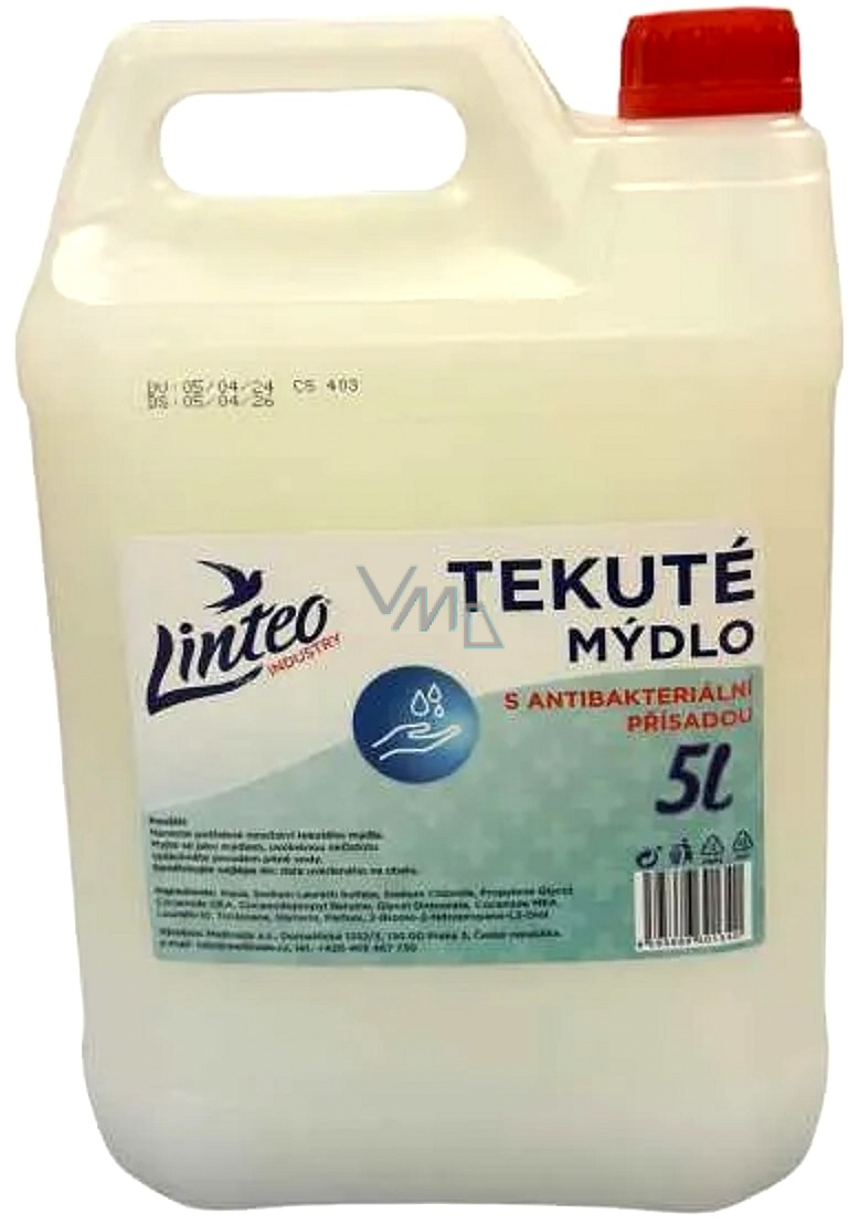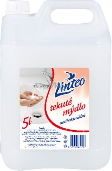 Antibakteriální tekuté mýdlo Linteo je dodáváno v balení po 5 litrech. Mýdlo má bílou barvu.