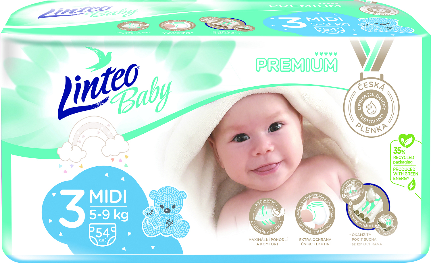 Die Premium-Windeln Linteo Baby machen glückliche Kinder, aber auch Mütter. Dank der absorbierenden Kanäle nehmen die Windeln sofort Flüssigkeit auf, die gleichmäßig in die Kanäle verteilt wird, die die Flüssigkeit einschließen, um ungewolltes Auslaufen zu verhindern.