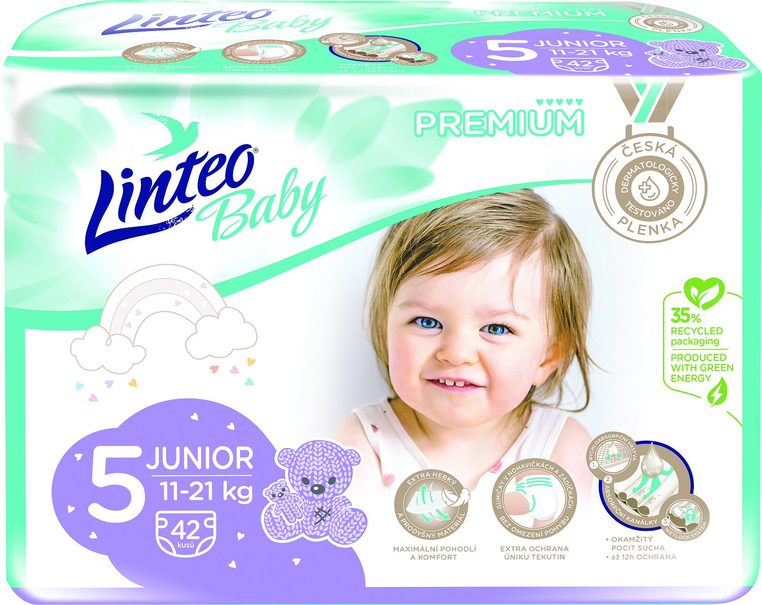 Premium Windeln Linteo Baby machen glückliche Kinder, aber auch Mütter. Dank der absorbierenden Kanäle nehmen die Windeln sofort die Flüssigkeit auf, die gleichmäßig in den Kanälen verteilt wird, die die Flüssigkeit einschließen und so unerwünschte Leckagen verhindern.