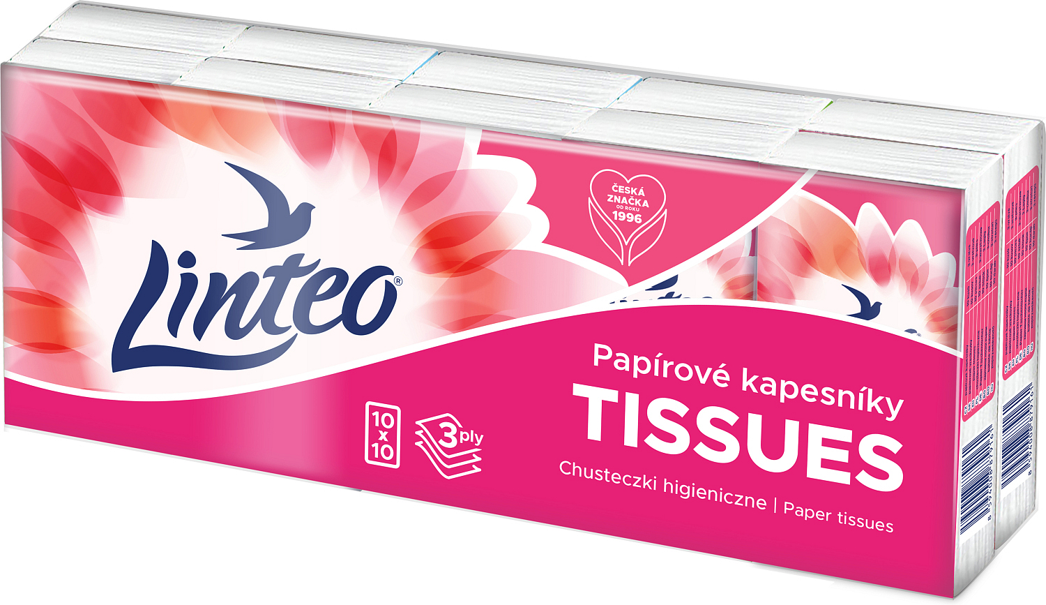 Feine weiße 3-lagige Papiertaschentücher von Linteo bieten Ihnen Sanftheit, Weichheit und Festigkeit. Diese Papiertaschentücher bestehen aus 100% Zellulose. Die Verpackung, die ein neues modernes Design hat, bietet 10 × 10 Stk.