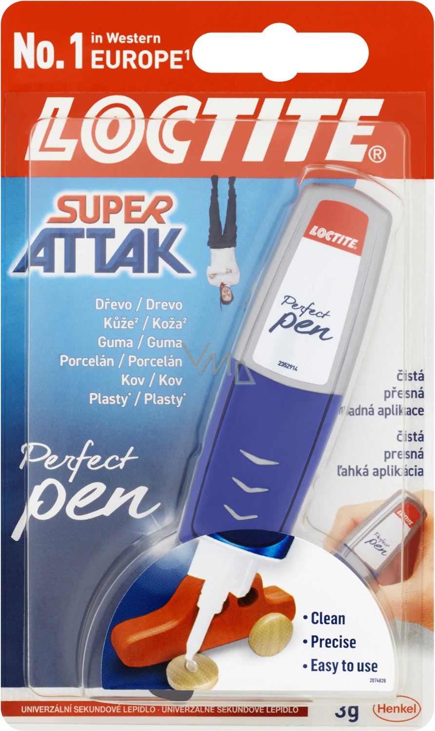 Loctite Perfect Pen je jednosložkové gelové vteřinové lepidlo v obalu ve tvaru pera, které se pohodlně stlačí a zabezpečí přesnou aplikaci lepidla. Gelová receptura zabrání stékaní lepidla a je vhodná také na svislé aplikace. Lepidlo je vhodné na použití v domácnosti, na menší rychlé opravy všech materiálů včetně plastů (mimo PE, PP, PTFE), kovu, dřeva, keramiky, kůže, kartonu a papíru.