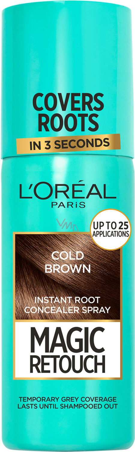 Verabschieden Sie sich in wenigen Sekunden von grauem Haar mit L'Oréal Magic Retouch Cold Brown. Dieses praktische Spray deckt sofort und zuverlässig nachwachsendes Haar sowie graue Haare ab und passt sich perfekt dem kühlen Braunton der Haare an. Es hält bis zur nächsten Haarwäsche, belastet das Haar nicht und verklebt es nicht, und dank der präzisen Düse lässt es sich leicht nur dort anwenden, wo es benötigt wird. Die kompakte 75 ml Verpackung ist ideal für Reisen und in der Handtasche.