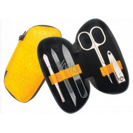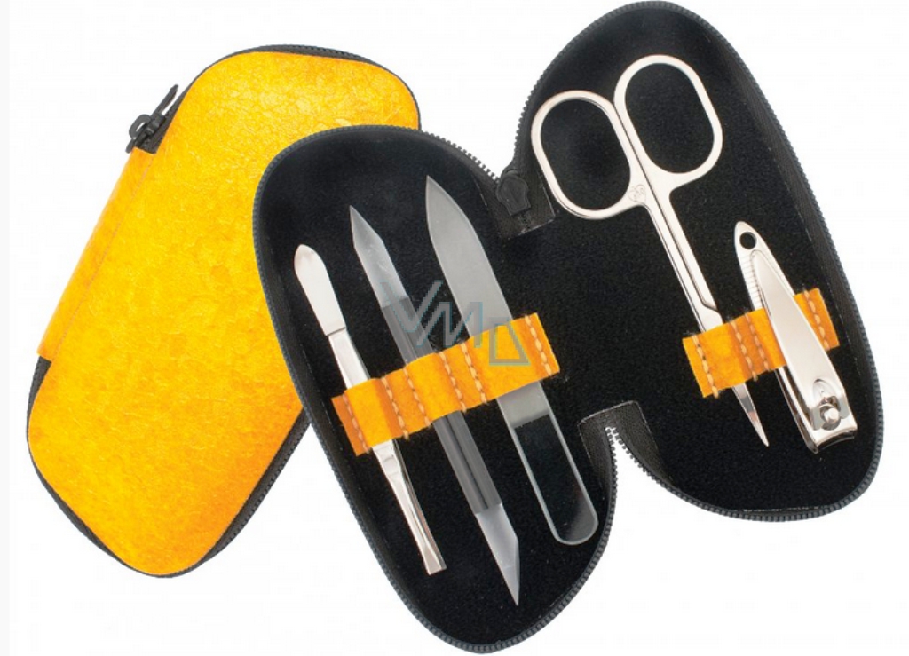 Praktická malá manikúrní sada 5-dílná ze žluté lesklé koženky uzavíratelná na zip obsahuje náčiní značky DUP a skleněné. Udělá radost každé ženě i slečně.