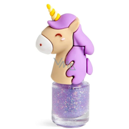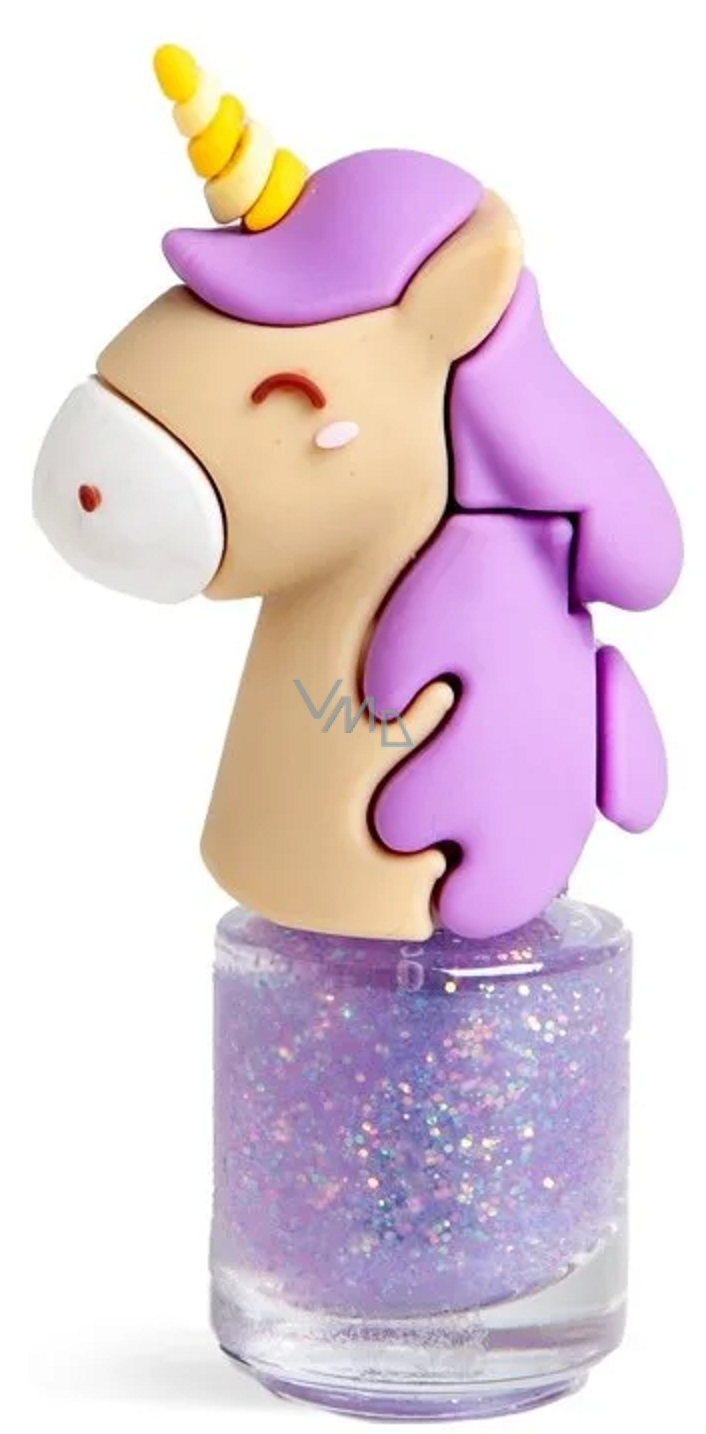 Fialový lak na nehty se třpytkami, který hlídá fialový jednorožec. Ideální dárek pro malé parádnice.