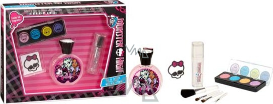Dárková sada Monster High obsahuje EDT 50 ml, štětečky, lesky na rty, tetování. Monster High je škola pro monstra. Studují tam legendární monstra jako třeba zombie, vlkodlaci, upíři, duchové, mumie, roboti atd. Učitelé jsou také monstra. Jejich oblečení a styl se moc nemění od lidí, jen jsou trochu divočejší. Učí se lektvary, vědu, matematiku, jazyky, tělocvik a mnoho dalších.