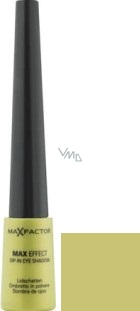 Sypké pudrové oční stíny Max Effect Dip-In Eye Shadow v 10 odstínech (8 původních + 2 nových) vynikají dokonale zašpičatěným houbičkovým aplikátorem, který se ideálně hodí pro přesnou aplikaci sypkého pudrového očního stínu. Sytá Perleťová barva bez obsahu mastku je zárukou rozzářeného pohledu. Vysoce perleťový a barevně sytý obsah znamená zářivou barvu líčení.