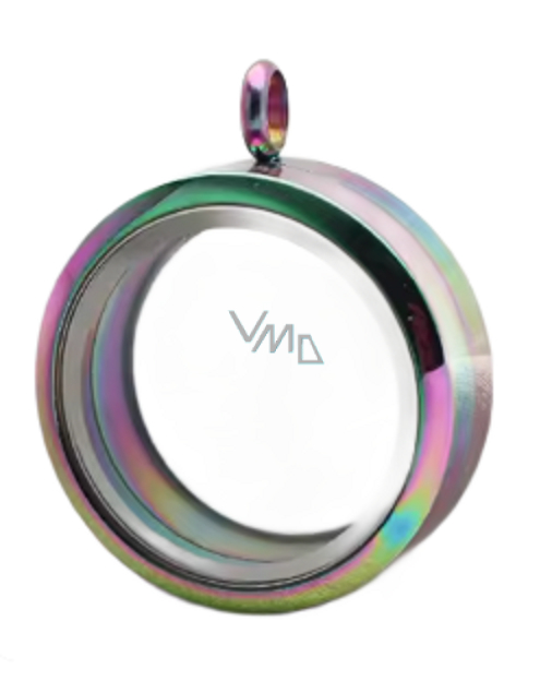 Elegantní „memory“ medailon z nerezové oceli s průhlednými okénky a bezpečným otočným (závitovým) uzávěrem – duhový, Ø 30 mm (tl. 11 mm). duhová povrchová úprava krásně mění barvy podle světla. Vložte dovnitř drobné kamínky, korálky, mini šarm, sušený květ či jinou vzpomínku a noste ji u srdce.