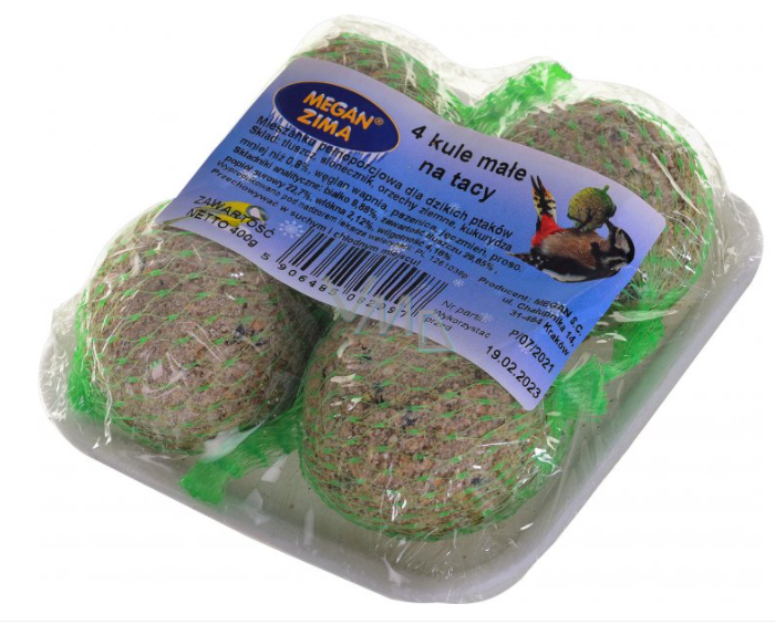 Doplňkové krmivo pro ptáky. Vysokoenergetické kompletní krmivo pro volně žijící ptactvo ve formě 4 malých kuliček. Obsahuje olejnatá semena, tuk a obiloviny.