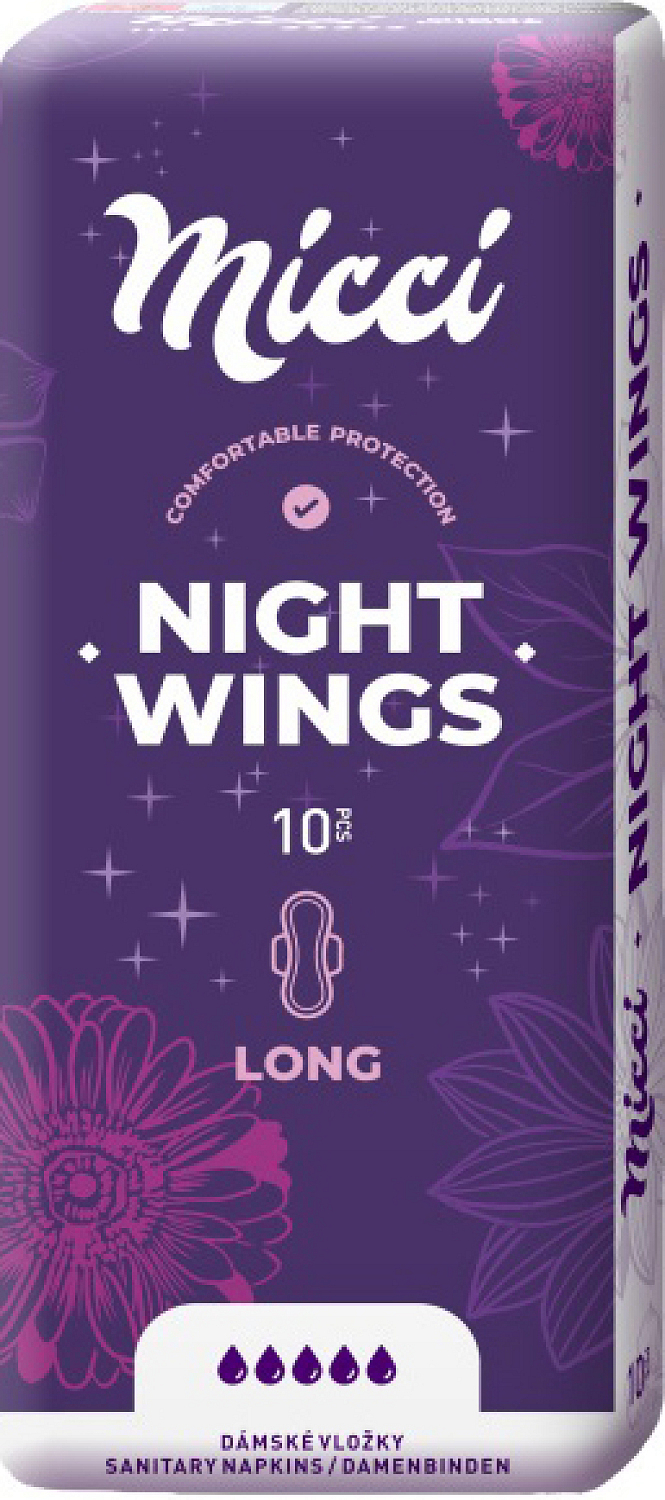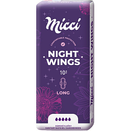 Micci Classic Night Hygieneeinlagen mit Flügeln, die insbesondere für die nächtliche Verwendung mit einer auffällig hohen Saugfähigkeit bestimmt sind. Die Flügel sorgen für einen hervorragenden Halt der Einlage und damit auch für perfekten Schutz. Dank der Oberfläche aus Vliesstoff sind sie auch sehr angenehm auf der Haut.