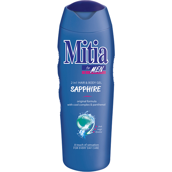 Mitia Sapphire for Men Duschgel und Shampoo 2in1, das ist das tägliche Gefühl maximaler Frische und Sauberkeit. Es enthält einen speziellen „cool complex“ mit kühlender Wirkung und dank des frischen Duftes und des reichhaltigen Schäumens wird das Duschen zu einem wahren Vergnügen. Ihre Haut benötigt tägliche sanfte Pflege. Lassen Sie sich von der bunten Palette der Mitia Duschgele verwöhnen. Ihre sanfte cremige Formel sorgt dafür, dass Sie sich nach jeder Ducherfrischung besser fühlen.