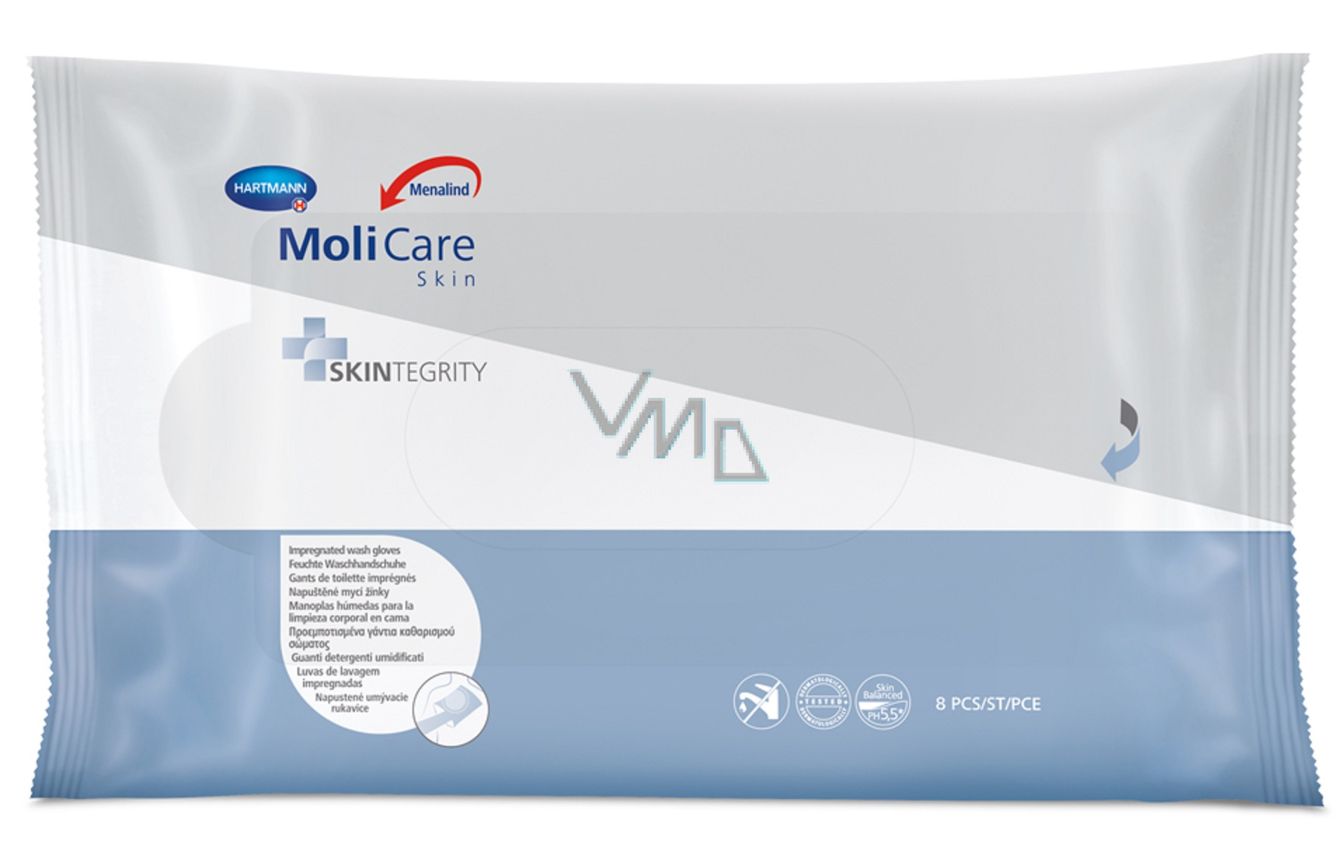 Napuštěné mycí žínky MoliCare Skin pro rychlé a ultra jemné čištění celého těla osoby na lůžku bez použití mýdla a vody. Speciální složení vyvinuto pro zralou, citlivou nebo namáhanou pokožku.