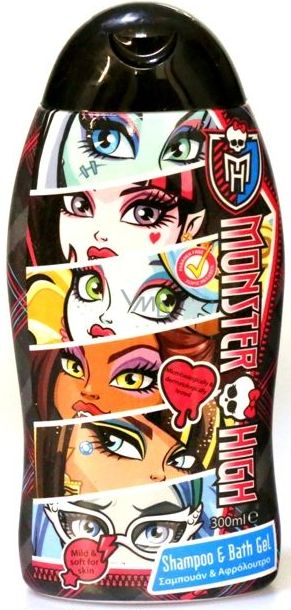 Monster High dětský šampon a sprchový gel 2 v1. Sprchový gel a šampón s oblíbeným motivem panenek Monster High. Monster High je škola pro monstra. Studují tam legendární monstra jako třeba zombie, vlkodlaci, upíři, duchové, mumie, roboti atd. Učitelé jsou také monstra. Jejich oblečení a styl se moc nemění od lidí, jen jsou trochu divočejší. Učí se lektvary, vědu, matematiku, jazyky, tělocvik a mnoho dalších.