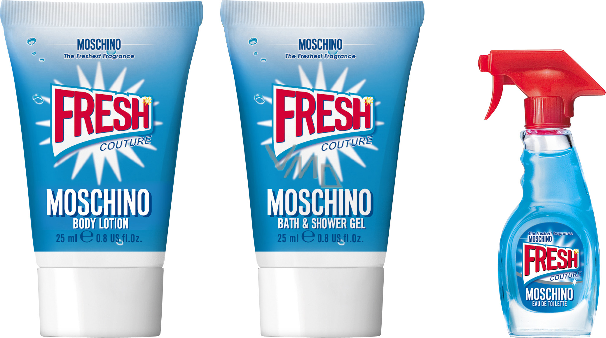 Moschino Fresh Couture Eau de Toilette 5 ml + Duschgel 25 ml + Körperlotion 25 ml, Geschenkset