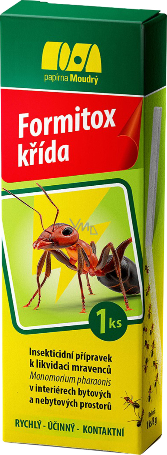 Formitox Kreide zur Bekämpfung von Ameisen ist ein schneller, wirksamer Kontakt- Insektizidpräparat in Form von weißer Kreide zur Bekämpfung von Ameisen der Art Monomorium pharaonis (Pharaoameise) in Wohn- und Nichtwohnräumen. Die Wirkdauer beträgt ca. 30 Minuten nach der Anwendung.