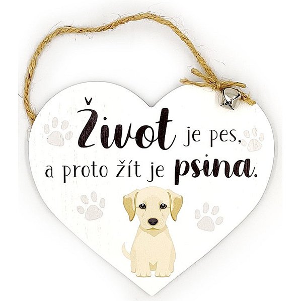 Vyhrazeno pro milovníky čtyřnohých mazlíčků! Patříte mezi ně? Udělejte si radost malou dřevěnou dekorací ve tvaru srdce, kterou lze pověsit na dveře nebo na zeď. Cedulka s textem „Život je pes a proto žít je psina“ dá všem na vědomí, kdo je v tomto domě pánem.