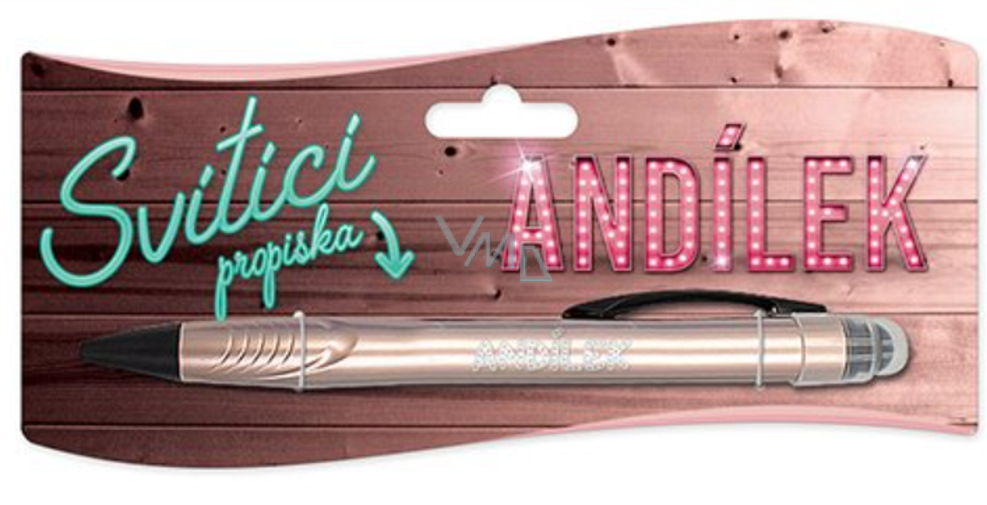 Světýlko ukryté uvnitř propisky rozzáří každé jméno. LED světlo se rozsvítí po stisknutí tlačítka propisky a tuhu lze vysunout pootočením jejího hrotu