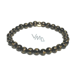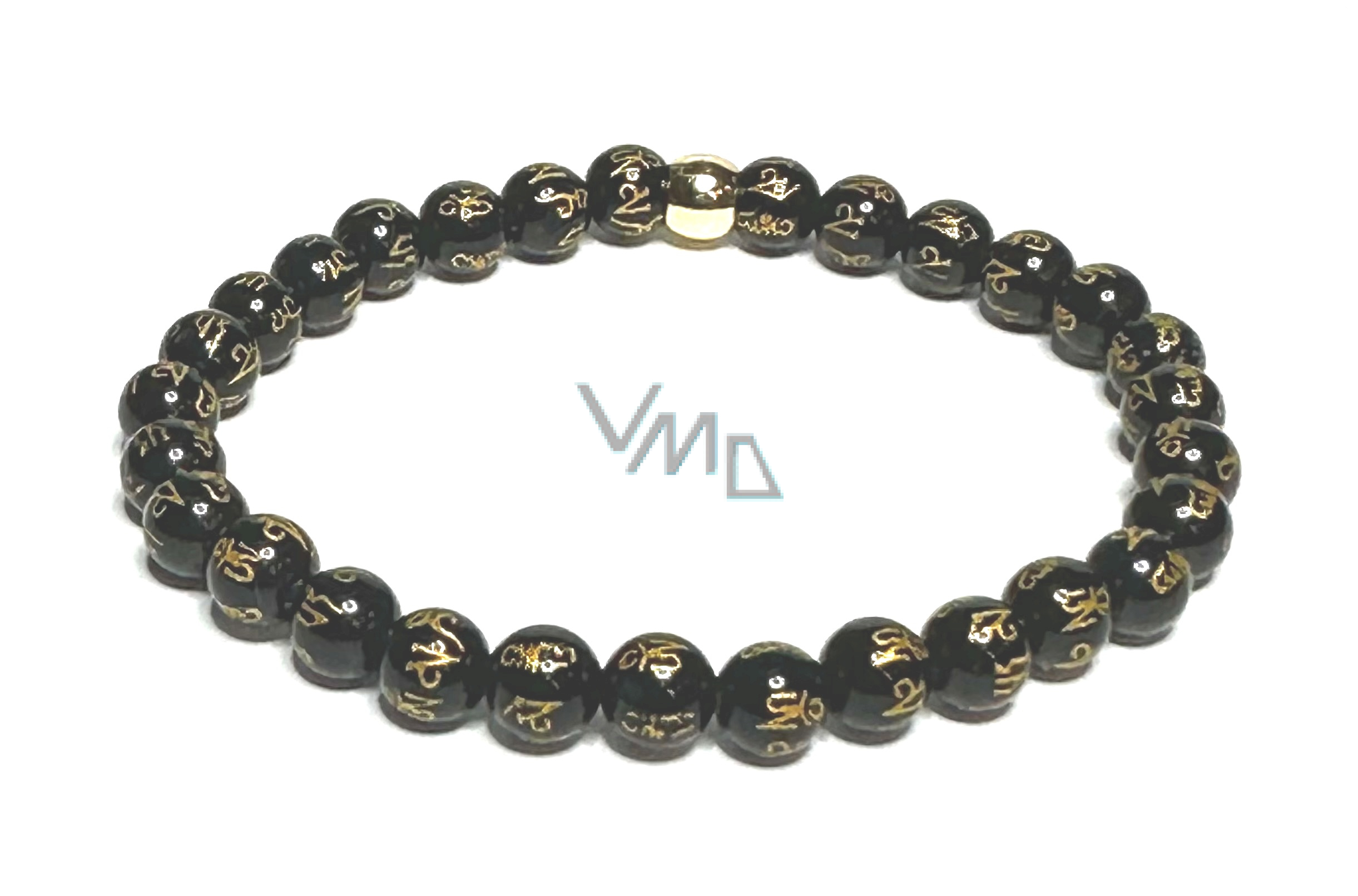 Schwarzer Achat mit königlichem Mantra Om elastisches Armband aus Naturstein, Kugel 6 mm / 16 - 17 cm, verleiht Mut und Stärke