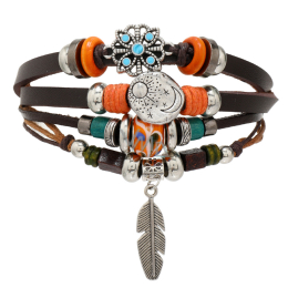Mehrlagiges Lederarmband, Feder + Mond-/Sonnensymbol, größenverstellbar