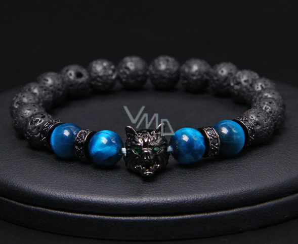 Lava schwarz + Tigerauge hellblau + Wolfskopf Armband elastischer Naturstein, Kugel 8 mm / 19 cm