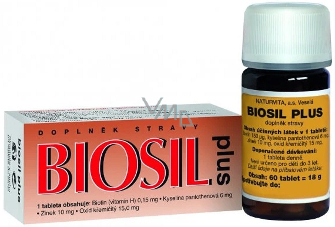 Naturvita Biosil Plus je doplněk stravy s obsahem Biotinu, kyseliny pantothenové, zinku a oxidu Křemičitého. Jedná se o unikátní kombinaci vitaminů a minerálů (Biotin a Zinek) k udržení normálního stavu nehtů, vlasů a pokožky.
