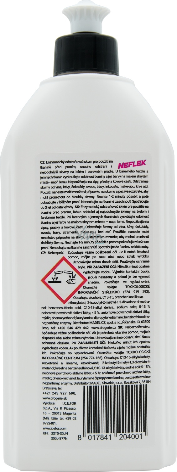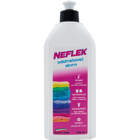 Flecken auf der Wäsche sind kein Problem mehr. Der enzymatische Flüssigreiniger Neflek hilft Ihnen, Flecken von Kugelschreibern, Schokolade, Ketchup, Fruchtmarmeladen, Mascara, Lippenstift oder getrocknetem Blut aus weißer und farbiger Wäsche effektiv zu entfernen. Dank der speziellen Verpackung mit Rillen benötigen Sie zum Reinigen von Flecken keinen weiteren Pinsel mehr.