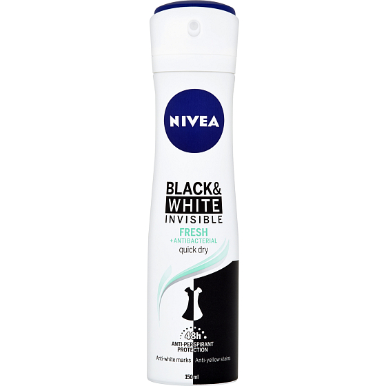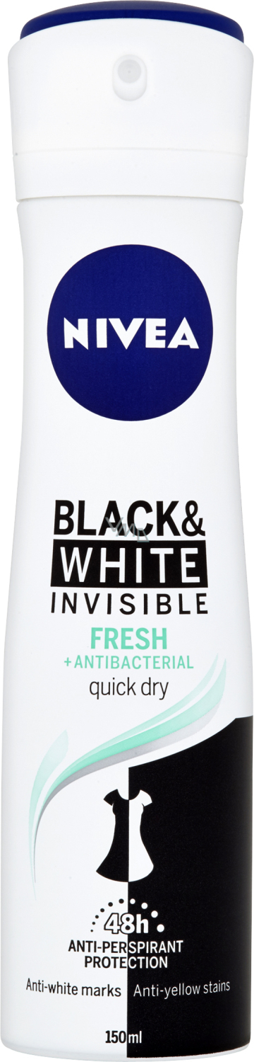 Genießen Sie einen Duft und ein Gefühl von Frische bis zu 48 Stunden und schützen Sie Ihre schwarzen Kleidung vor weißen Flecken und Ihre weißen Kleidung vor gelben Flecken. Kein Schweiß, kein Geruch und kein unangenehmes Gefühl mehr! Alkoholfrei, mit einem frischen Duft, den Sie lieben werden. Probieren Sie die Veränderung - Nivea B&W Invisible Fresh Sprüh-Antitranspirant.