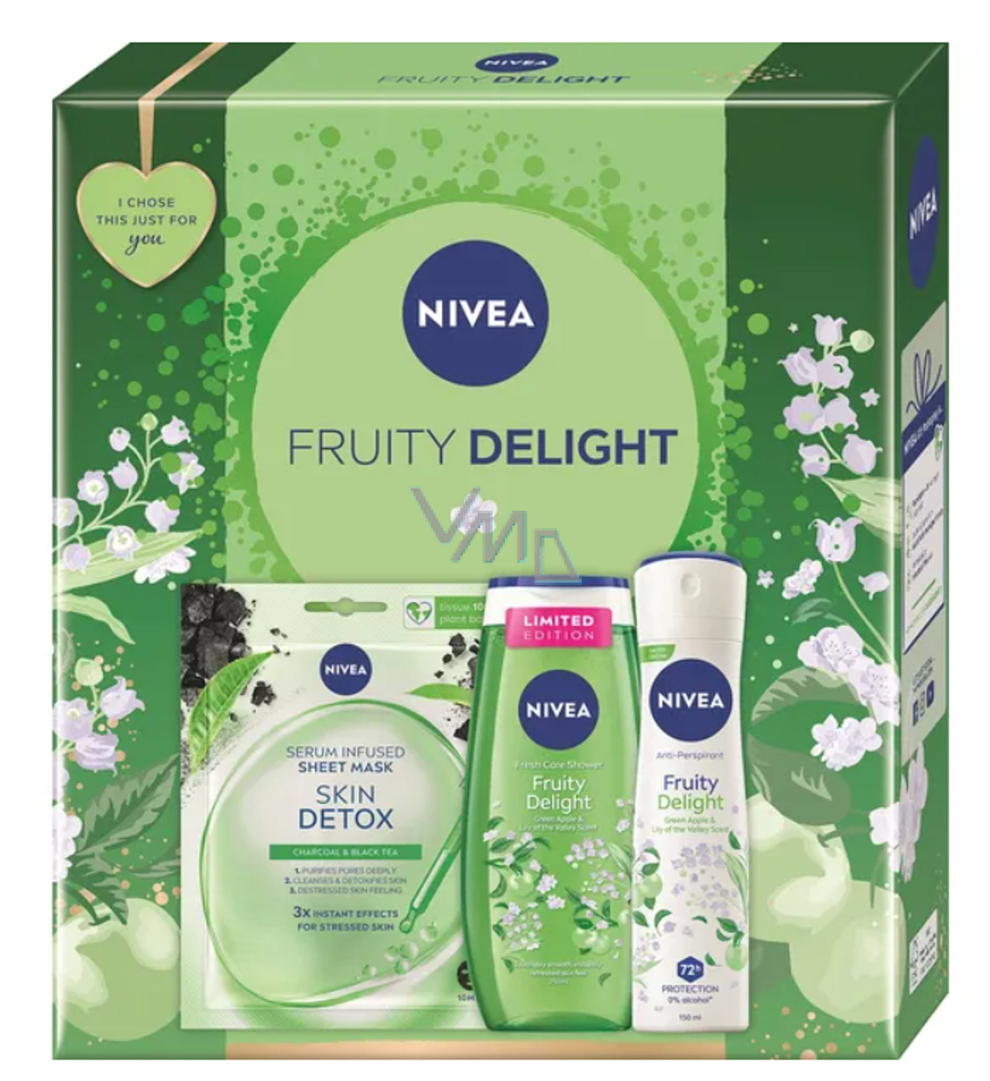 Nivea dárkový box Fruity Delight to je šťavnatá svěžest zelených Jablek, která potěší pod stromečkem každého milovníka ovoce. Co může být lepším dárkem než osvěžující balíček plný přírodních vůní a účinné péče. V balíčku naleznete detoxikační textilní masku s černým uhlím a zeleným čajem, která hloubkově vyčistí Póry a zanechá pleť zrelaxovanou. Králem celého balíčku je osvěžující sprchový gel Fruity Delight s vůní zelených Jablek, který vytvoří krásně bohatou a jemnou pěnu, která pečuje o pokožku celého těla. Posledním produktem v balení je antiperspirant Fruity Delight s ovocnou vůní a ochranou proti pocení na 72 hodin, který zajistí svěží pocit a sebejistotu i v těch nejnáročnějších dnech.