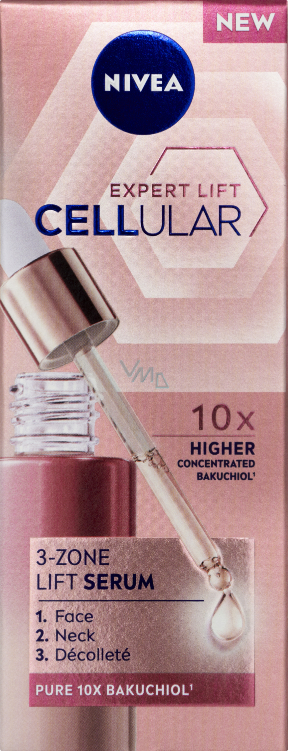 Wissenschaft für jugendlich aussehende Haut. Nivea® Serum Cellular Expert Lift. Das 3-Zonen-Serum wirkt tief auf zellulärer Ebene für einen sofortigen Lifting-Effekt im Gesicht, am Hals und im Dekolleté. Sichtbar reduziert es Falten und strafft die Konturen. Fortschrittliche Formulierung mit unserem höchsten Gehalt an Bakuchiol: 10x konzentrierter reiner Bakuchiol¹ stimuliert nachweislich die Regeneration der Hautzellen und die Bildung von 2 Arten von eigenem Kollagen der Haut.²
