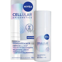 Das Verjüngungsserum Nivea Cellular Epigenetics Epicelline ist eine konzentrierte Pflege gegen die Hautalterung in einer praktischen 15ml Verpackung. Dank innovativer epigenetischer Technologie und des Epicelline-Komplexes unterstützt es die natürliche Zellregeneration, strafft die Haut und reduziert feine Linien und Falten. Es zieht schnell ein, hinterlässt keinen fettigen Film und lässt die Haut glatt, elastisch und frisch erscheinen. Ideal für die tägliche Anwendung und auf Reisen.