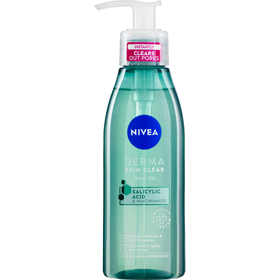 Nivea Reinigendes Gel für das Gesicht Derma Skin Clear für zu Unreinheiten neigende Haut mit Salicylsäure und Niacinamid reinigt die Haut und die Poren gründlich und entfernt überschüssigen Hauttalg. Vegane Formel - enthält keine Inhaltsstoffe tierischen Ursprungs.