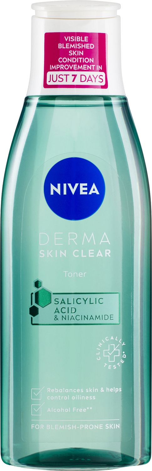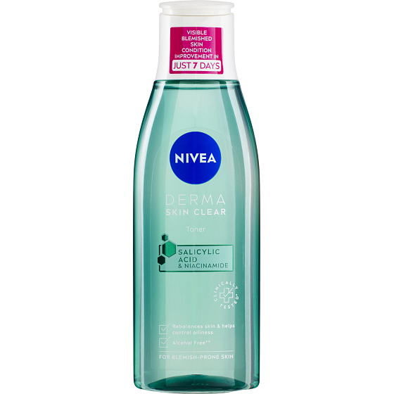 Nivea Reinigungs-Gesichtswasser Derma Skin Clear für zu Unreinheiten neigende Haut mit Salicylsäure und Niacinamid.