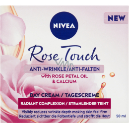 Nivea Tagescreme gegen Falten Rose Touch mit Rosenblütenöl und Calcium reduziert sichtbar die Tiefe der Falten und stärkt die Widerstandsfähigkeit der Haut gegen Austrocknung. Die Haut sieht gesund aus, ist strahlend, fest und frisch. Der zarte Duft verwöhnt die Sinne.