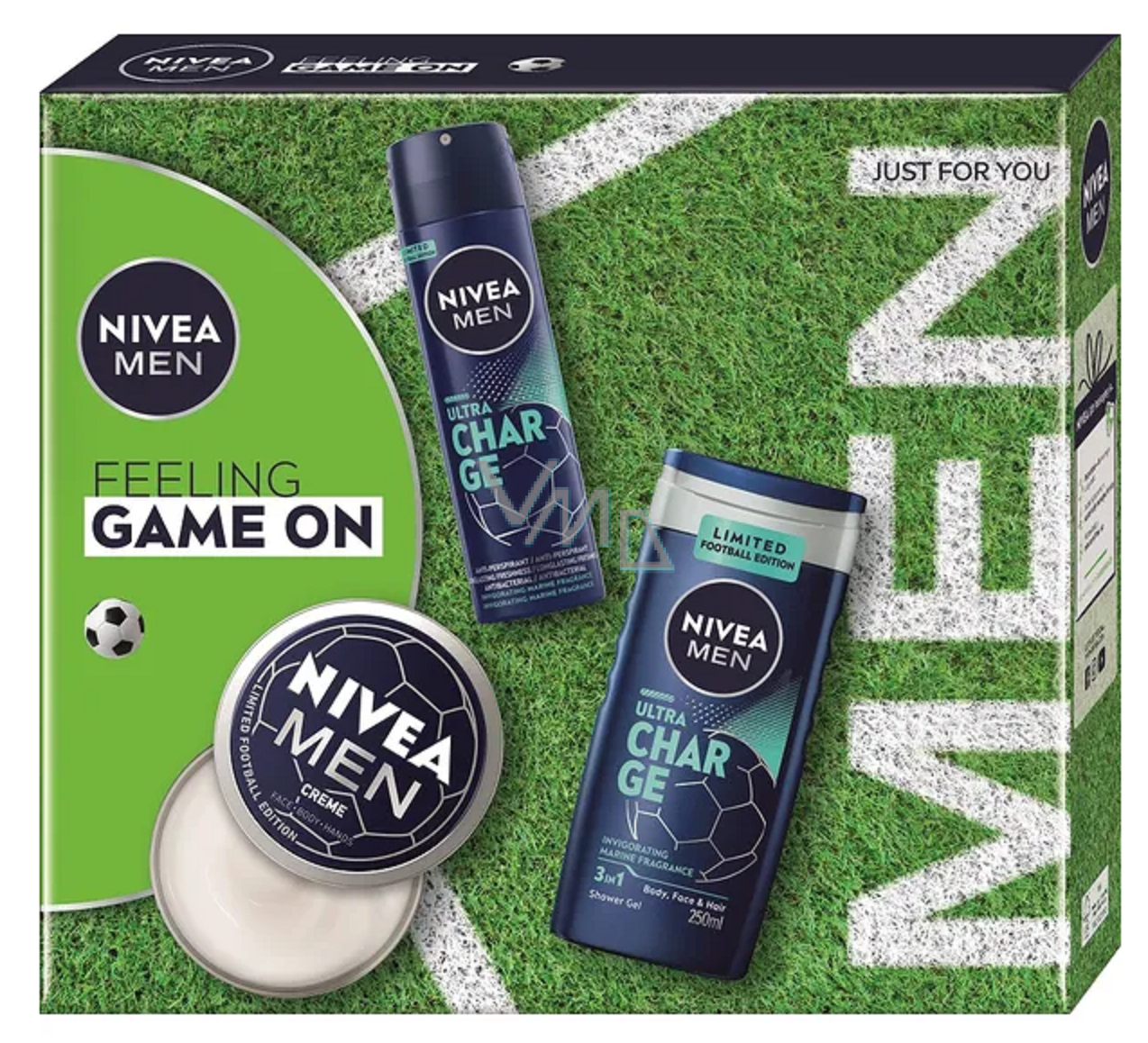 Nivea Men Feeling Game on Gesichts-, Körper- und Handcreme 150 ml + Nivea Men Ultra Charge Antitranspirant Spray 150 ml + Nivea Men Ultra Charge Duschgel 250 ml, Pflegeset für Männer