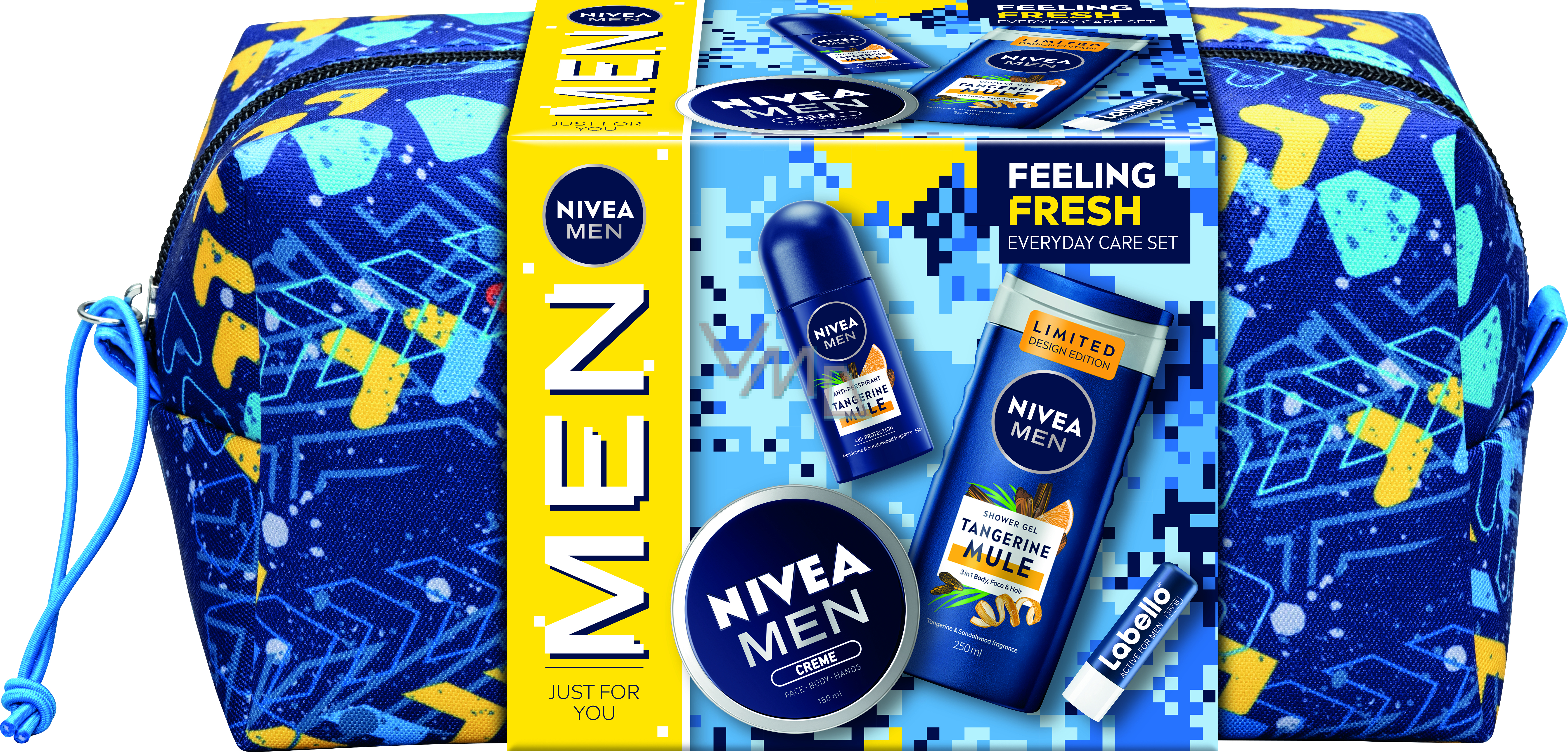 Nivea Men Feeling Fresh Tangerine Mule Duschgel 250 ml + Tangerine Mule Antitranspirant Roll-on 50 ml + Creme 150 ml + Labello for Men Active Care Lippenbalsam 4,8 g + Kosmetiktasche, Kosmetikset für Männer