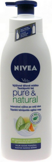Intenzivní výživa velmi suché pokožky po celý den. Obsahuje Bio olej z arganiového ořechu a Bio jojobový olej. Nivea Výživné tělové mléko Pure & Natural pro velmi suchou pokožku s obsahem přírodního oleje z arganiového ořechu a jojobového oleje, získaných biologickou cestou, bylo vyvinuto pro potřeby velmi suché pokožky. 95% ingrediencí přírodního původu