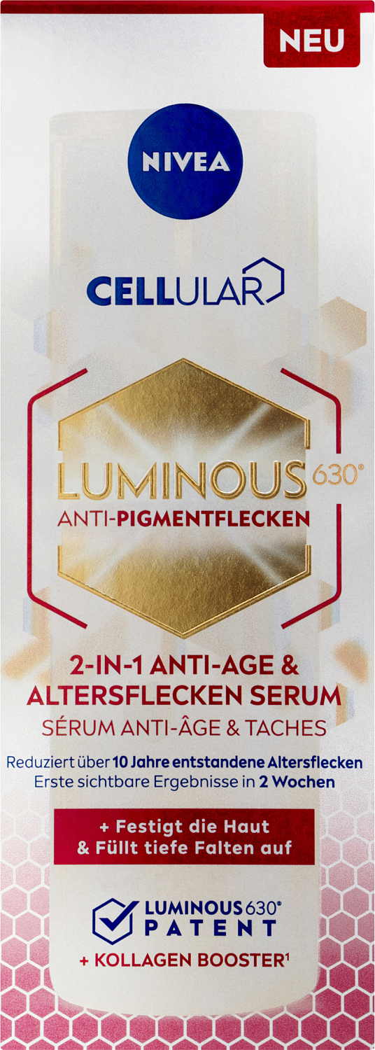 Nivea verjüngendes Serum gegen Pigmentflecken Cellular Luminous630. Die spezielle Formulierung des Serums wirkt auf zellulärer Ebene: Luminous630® reduziert und hellt dunkle Flecken auf und verhindert die Entstehung neuer. Hyaluronsäure aktiviert die Hautzellen**, füllt aus und hydratisiert die Haut intensiv.