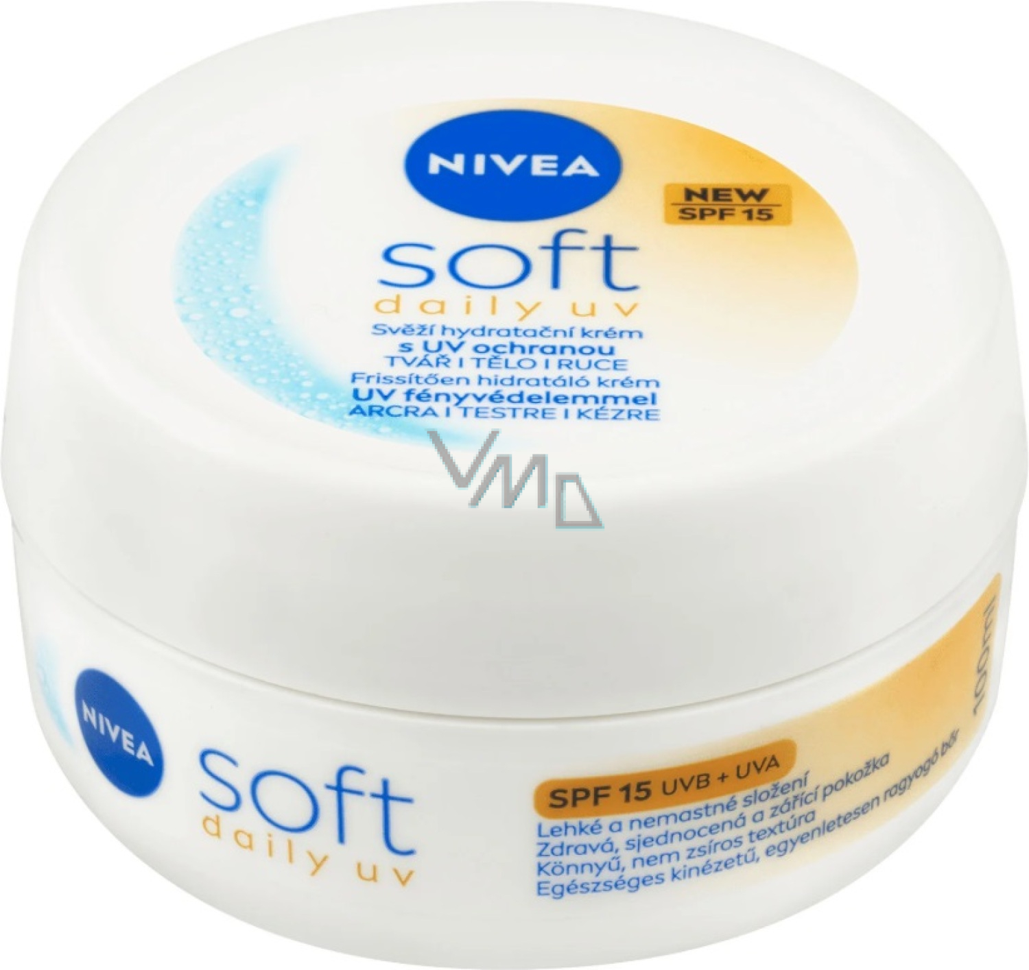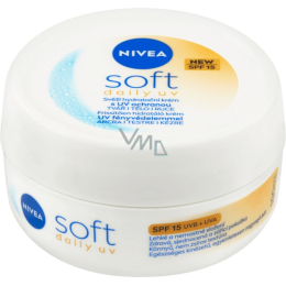 Nivea Soft Daily UV ist eine leichte, universelle Feuchtigkeitscreme mit SPF 15, bestimmt für die tägliche Pflege von Gesicht, Körper und Händen. Sie kombiniert tiefe Hydratation mit Sonnenschutz.