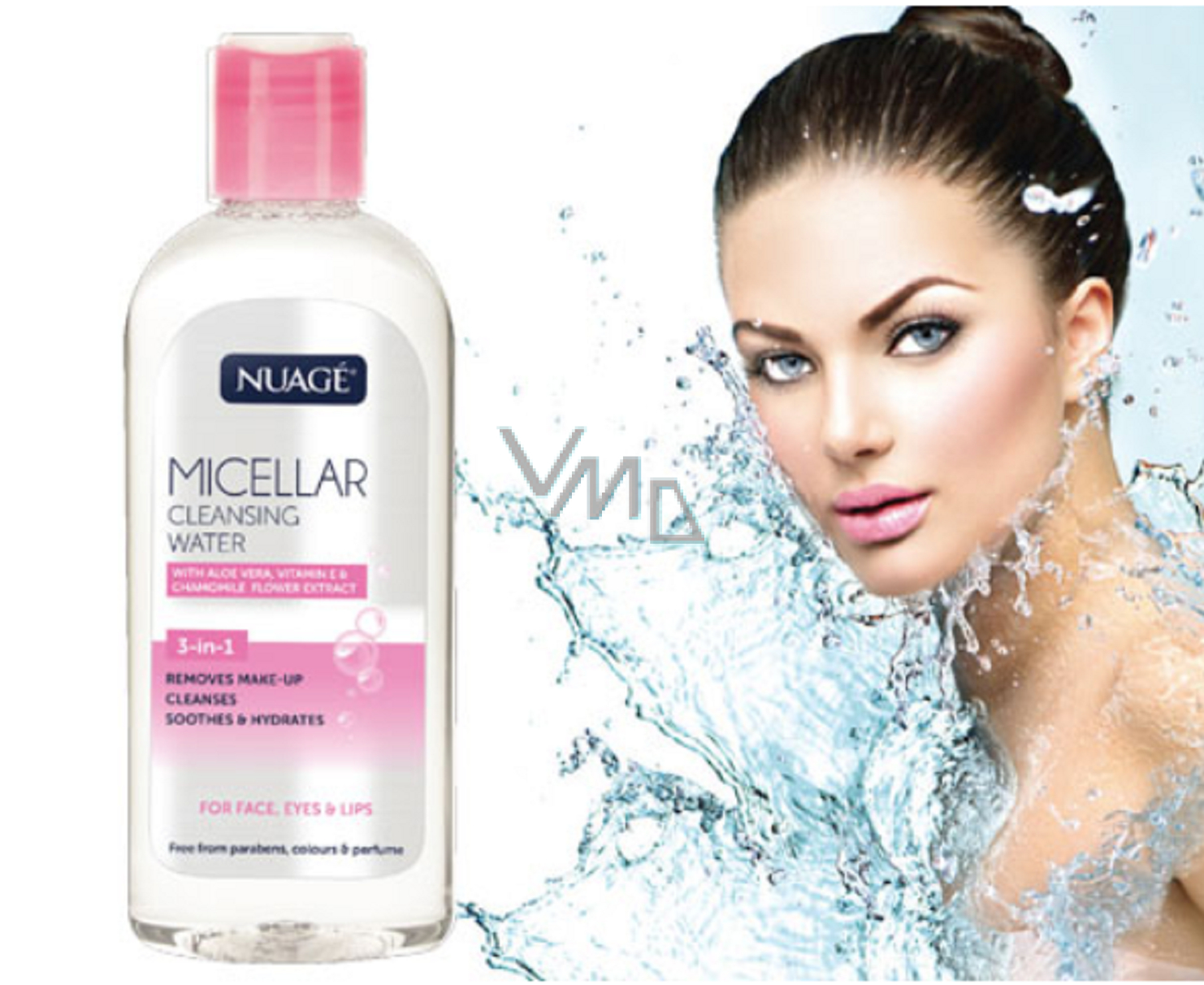 Micelární čistící voda s Aloe Vera, Vitamínem E & Extraktem z Heřmánku 3v1. Nuagé Micelární čistící voda je jednoduchá a efektivní cesta k odstranění make-upu, čistí, uklidňuje a hydratuje vaši pokožku. Při nanesení na pokožku se čistící činidla naváží na mastnotu a nečistoty a rychle a efektivně je odstraní. Nuage Micelární čistící voda používá velmi mírné, ale efektivní čistící prvky. Nepálí a nenatahuje, je dost silná k odstranění očního make-upu bez potřeby odstraňovat make-up samostatně.