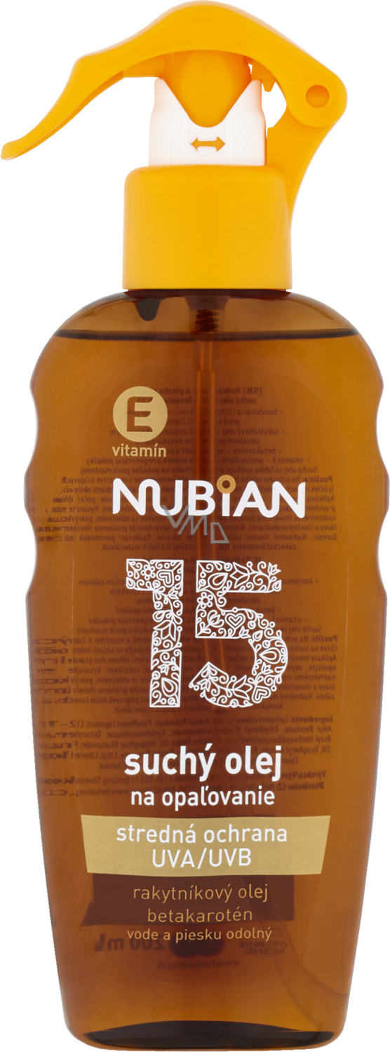 Chraňte svou pokožku při opalování a získejte zlatavý odstín opálení se suchým olejem na opalování Nubian SPF 15.