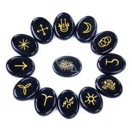 Obsidian Runen-Alphabet ovaler Naturstein, 15 x 20 mm 13 Stück Buchstaben, heiliges Symbol, Heilstein, Rettungsstein