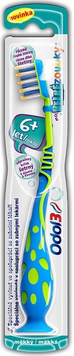 Zubní kartáček Odol3 moje Velké zoubky byl speciálně vyvinut ve spolupráci se zubními lékaři pro děti od 6 let. Různě dlouhé štětiny pomáhají čistit kombinaci mléčných, chybějících a stálých zubů. Atraktivní vzhled hlavy kartáčku motivuje děti k pravidelnému čištění zubů.