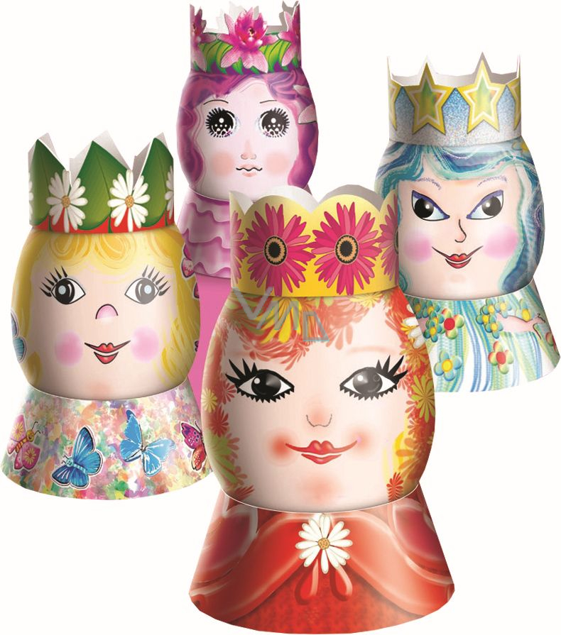 Ovo velikonoční sada obsahuje 8 košilek obličejů na vejce, ale především barevné papírové polotovary 4 sukýnky jako podstavce a 4 čelenky nebo korunky.