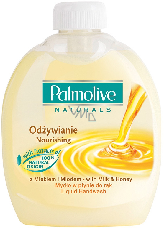 - Palmolive Nourishing tekutý přípravek na mytí rukou neobsahuje mýdlo a je obohacen o 100% přírodní výtažky z medu a aloe vera.
