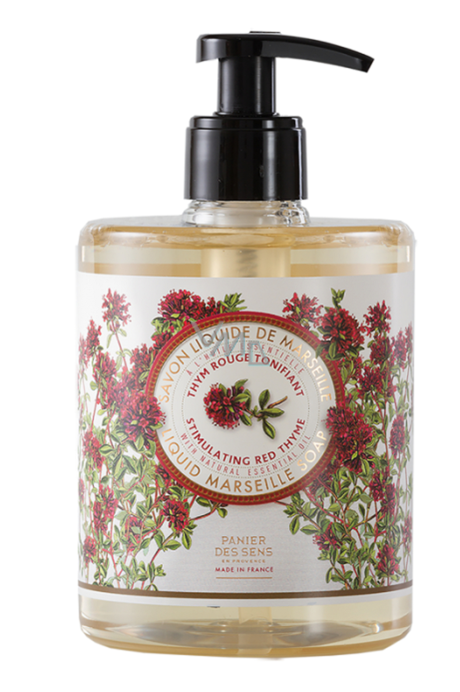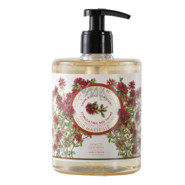 Tekuté mýdlo na ruce s vůní červeného tymiánu. Vyrobeno tradiční metodou výroby mýdel z Marseille. Povzbuzující tekuté mýdlo obohaceno o omlazující a povzbuzující esenciální olej z červeného tymiánu.