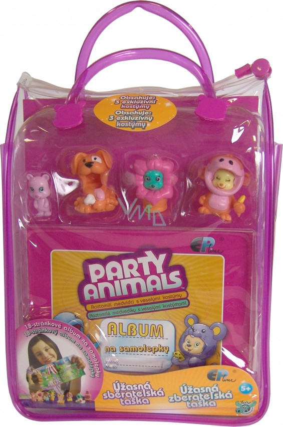Šup do kostýmu! 9 roztomilých medvídků, 50 barevných kostýmků pro 8 různých párty. A k tomu ještě samolepky Party Animals, které můžeš nalepit třeba do alba. Seznam se s medvídky! Přečti si jejich krátký příběh a vytvoř si svět Party Animals. Nalep do svého alba samolepky medvídků v kostýmech podle typu party. Zaškrtávej si, které samolepky již máš. A taštičku můžeš použít pro svou sbírku.